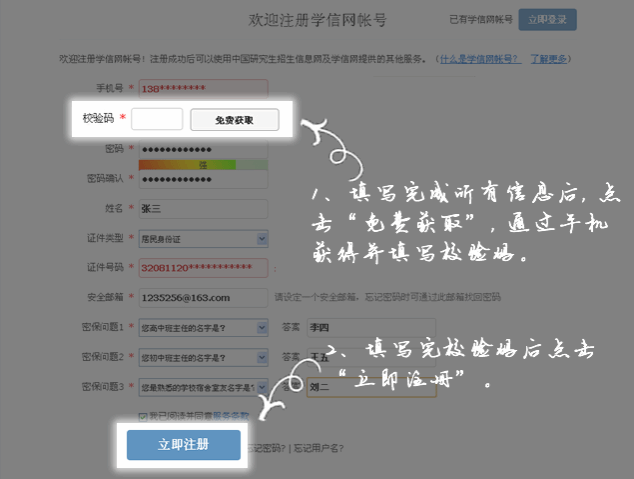 第四步:填写注册信息,并获得校验码(注意先填写信息后再获取校验码,因为校验码有时间限制)