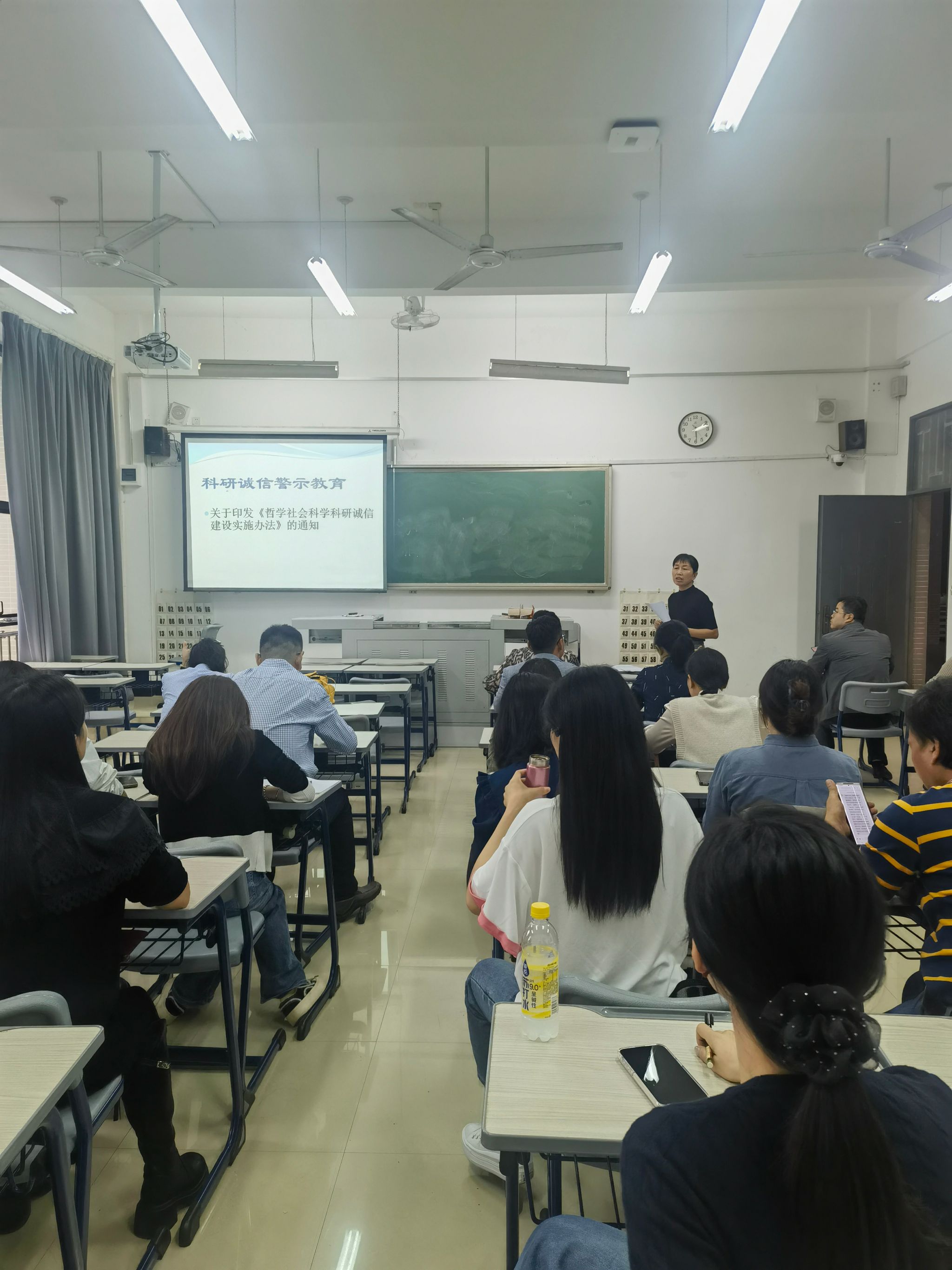 为深入学习贯彻党的二十届三中全会和全国教育大会精神,落实中共中央、国务院关于加强科研诚信建设的总体要求。根据《关于开展科研诚信警示教育活动的通知》(商院科研〔2024〕52 号)文件要求,我院于2024年11月12日下午,在全院教职工范围内开展科研诚信警示教育活动。