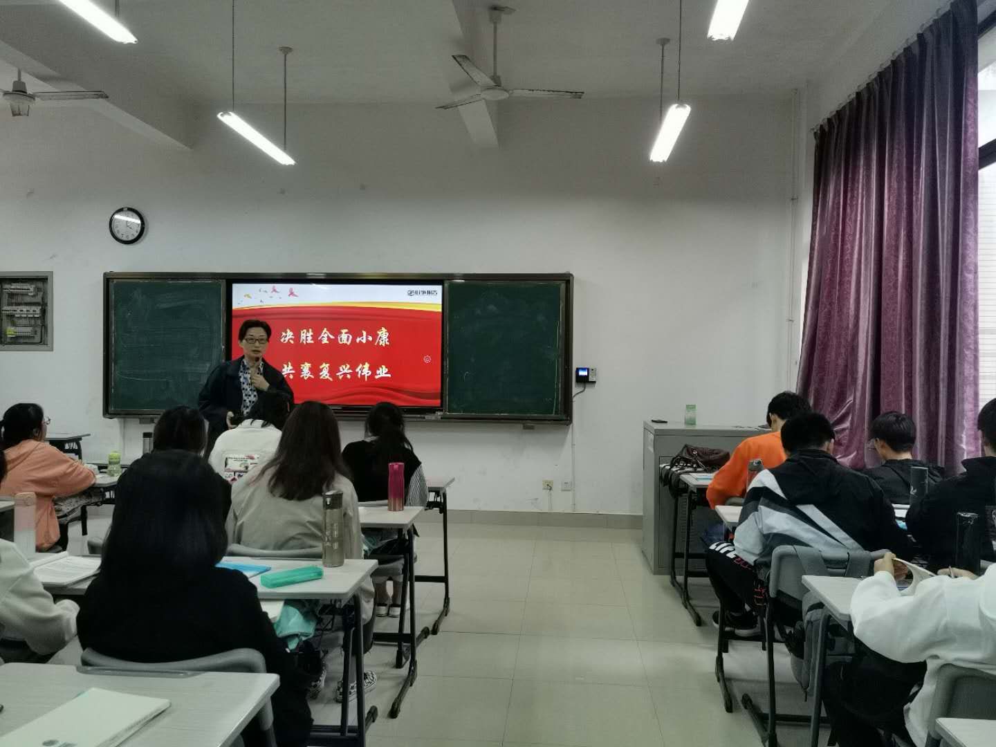 11月4日下午,我院王瑜院长给2020级旅游管理与服务教育专业学生上题为《决胜全面小康 共襄复兴伟业》的形势与政策课。王瑜院长从千年梦想庄严承诺、砥砺奋进步履铿锵、乘势而上书写新章等三个方面向同学们讲述,重点解读了全面建成小康社会的基本内涵及要求,介绍了全面建成小康社会的现实基础,分析了全面建成小康社会对第二个百年奋斗目标实现的重要性,勉励同学们认真学习,勤于实践,为中华民族复兴伟业做贡献。王瑜院长每学期通过形势与政策课、党课等形式,深入课堂,深入学生,积极践行引导学生树立社会主义核心价值观。