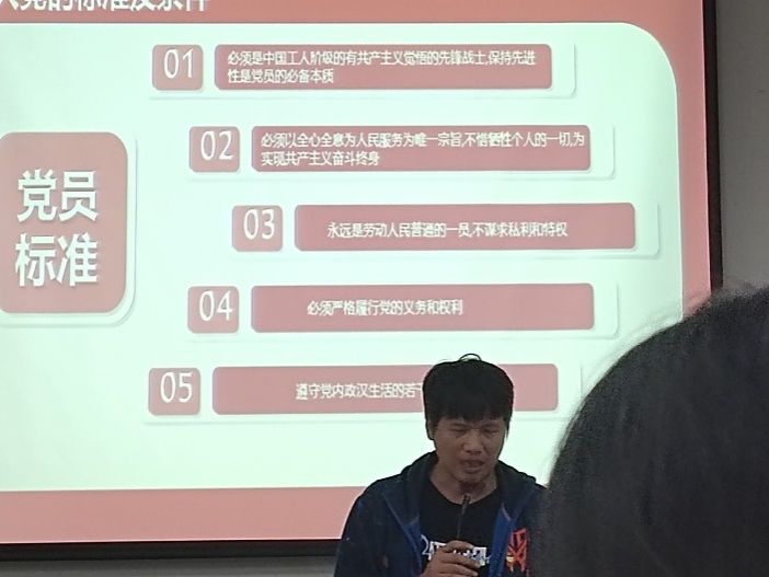 随后,官老师就入党流程和入党条件等内容进行了相关实务培训,详细介绍了“入党申请人-入党积极分子-党员发展对象-预备党员-正式党员”的入党程序,指出了撰写入党申请书的基本格式和需要注意的问题。