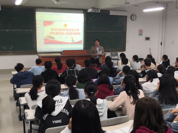 11月8日晚上,旅游与酒店管理系党总支副书记刘祝明副教授在诚信楼中阶教室三对我系2018级307名学生进行了《学习习近平总书记在北京大学师生座谈会的讲话精神》宣讲会。