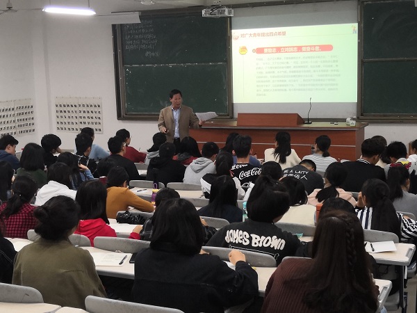 刘祝明副书记结合自己的读书经历和工作经历,向参加此次宣讲会的同学阐释了“四点希望”的内涵。并对2018级新生们提出了几点建议:一要培养良好的品德,学会做人,知道怎样待人接物、与人相处;二要勤奋,知道怎样学习,养成良好的学习习惯、生活习惯,扎实掌握专业知识,以后立足于工作岗位,做一个对社会有用的人;三是要加强体育锻炼,保持健康体魄,朝着德智体美劳全面发展。